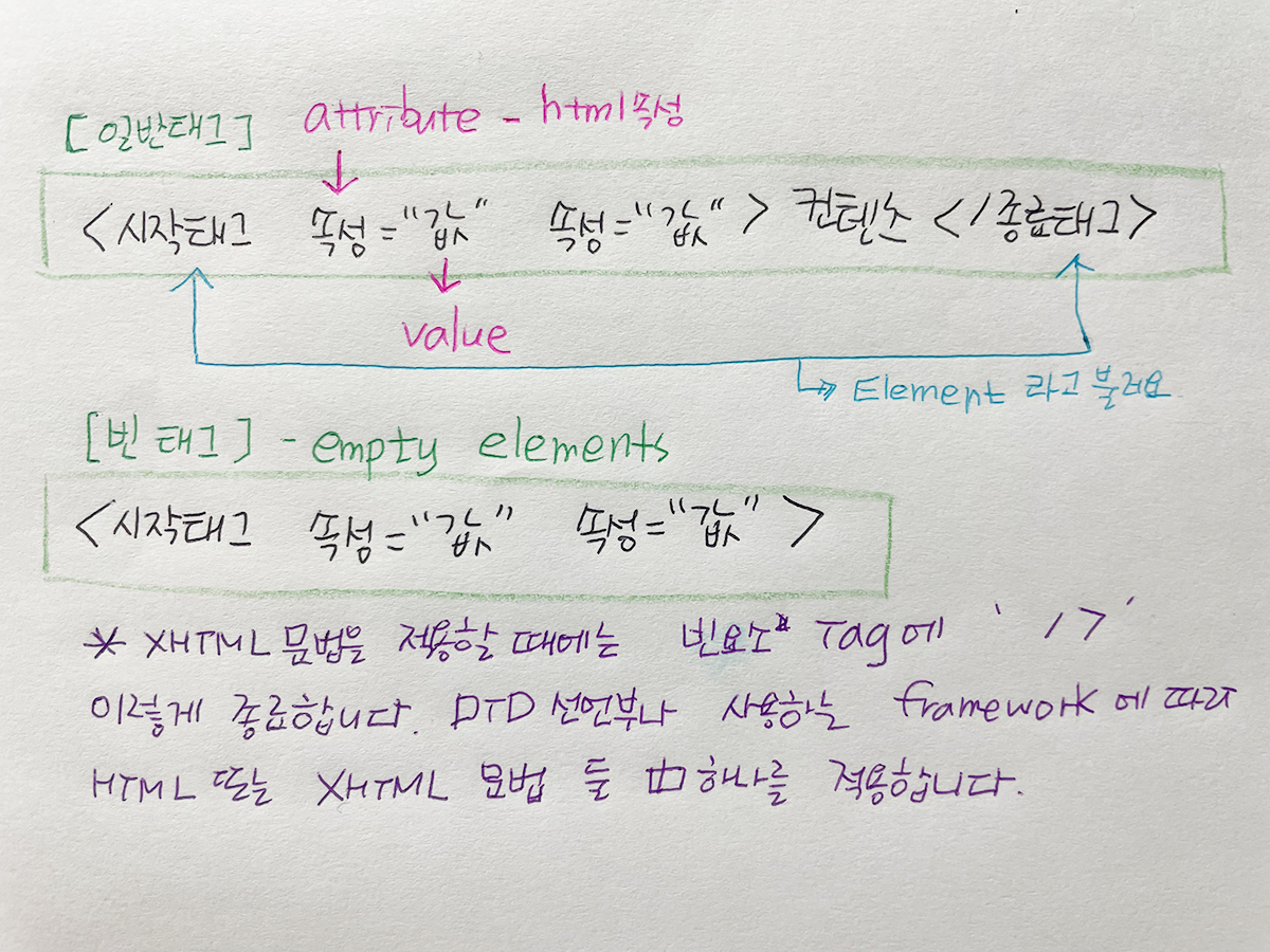 - 하여, 현재는 HTML문법과 XHTML문법 둘다 사용이 가능합니다.