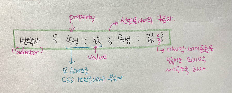 - 이때에 어떠한 태그를 선택하여 스타일링 할지 선택해야하는데요, 이것을 우리는 셀렉터(선택자)라고 부릅니다.