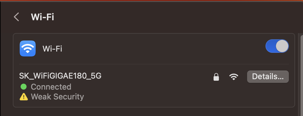 설정 > 네트워크 메뉴로 들어가서 연결된 와이파이를 선택 한후, 와이파이 이름 우측의 Details (상세정보)를 클릭하면, 팝업창 하단에 IP 주소가 출력되어있다.