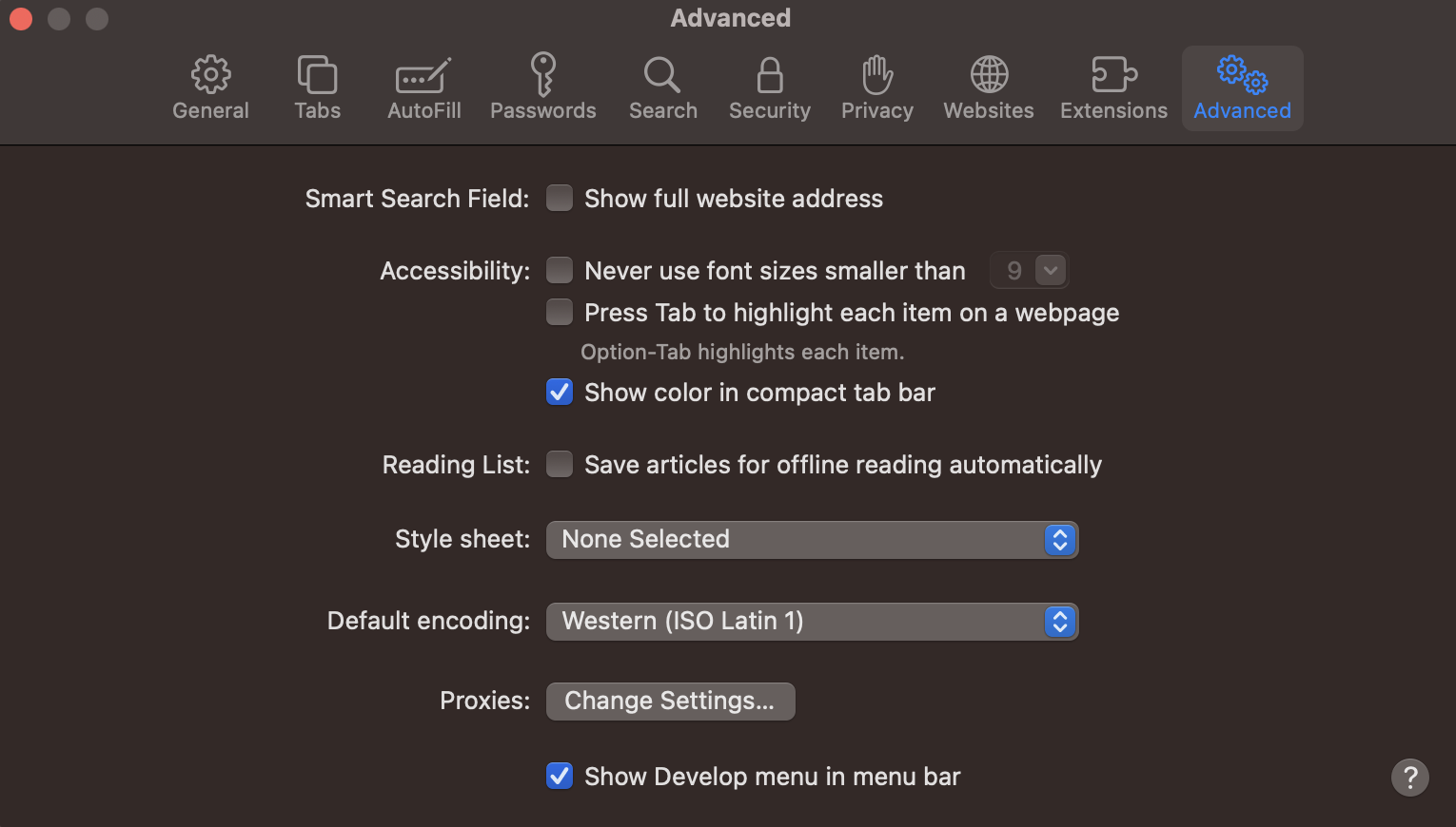 4. 사파리브라우저를 실행시키고, 설정 > 고급설정(Advanced)탭에서 하단에서