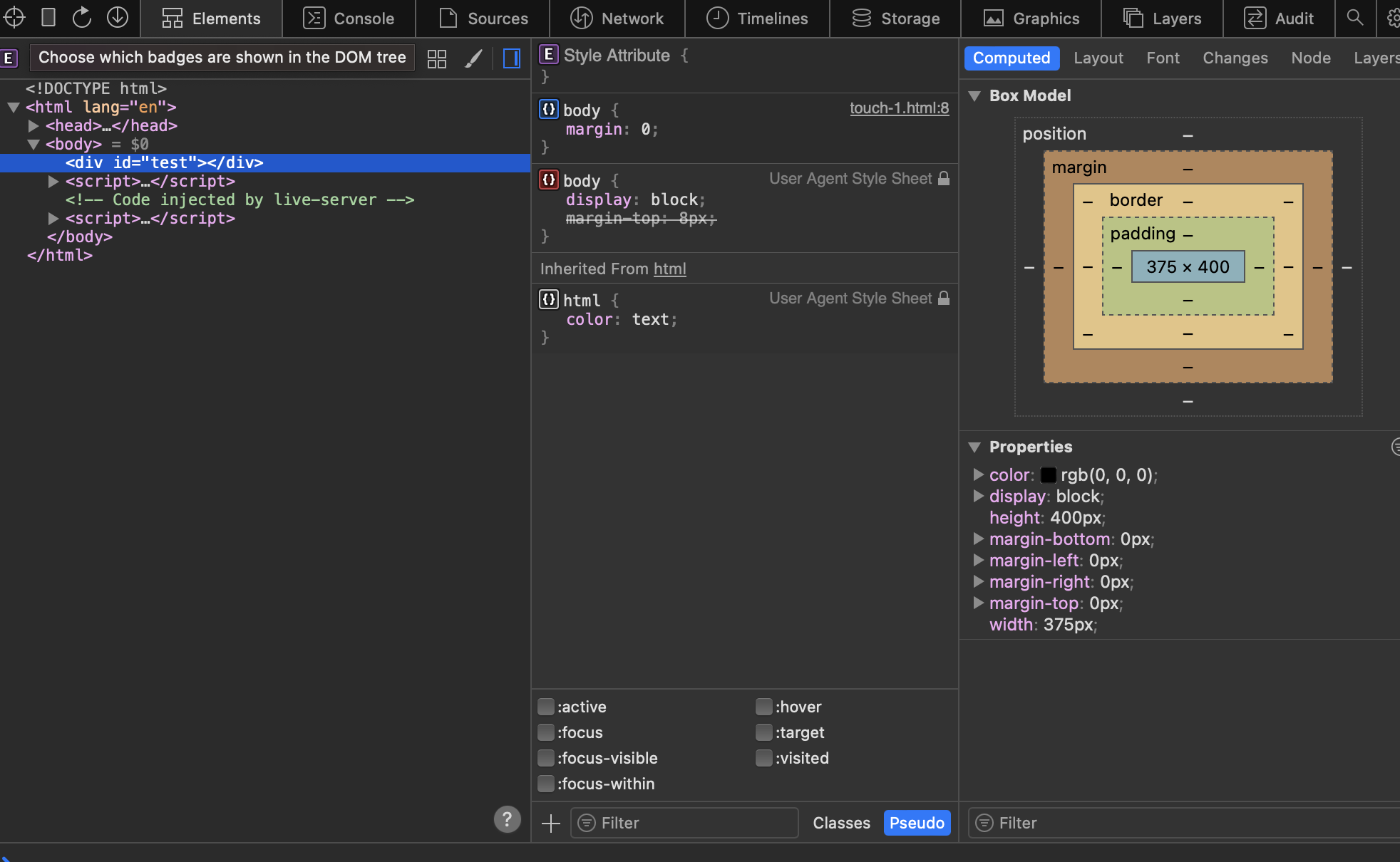 3. 아래와같이 인스펙터(개발자도구)가 활성화되고 모바일에서 터치 및 작업을 하면 mac 개발자도구로 바로바로 확인이 가능하다!!